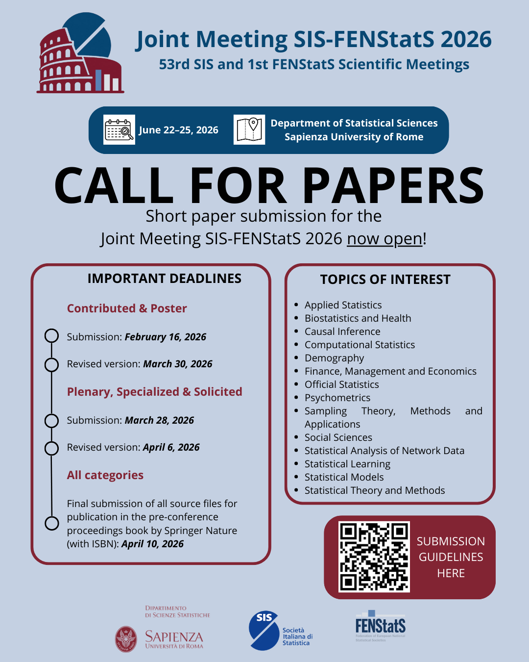 We are pleased to announce that submissions are now open for short papers for the 53rd Scientific Meeting of the Italian Statistical Society (SIS), which this year will be held in conjunction with the 1st Conference of European Statistical Societies (FENStatS) (https://sis2026.sis-statistica.it/).
